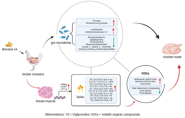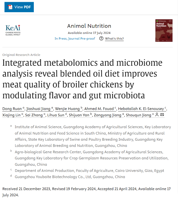 近日,动科所家禽营养研究团队联合院基因中心品质控制与多组学技术创新团队在国际学术期刊《Animal Nutrition》(中科院一区TOP期刊,IF = 6.3)发表“Integrated metabolomics and microbiome analysis reveal blended oil diet improves meat quality of broiler chickens by modulating flavor and gut microbiota”的研究论文,动科所阮栋研究员为论文第一作者,家禽营养研究室主任蒋守群研究员为论文通讯作者。院基因中心晏石娟研究员团队为本研究提供了重要技术支撑。