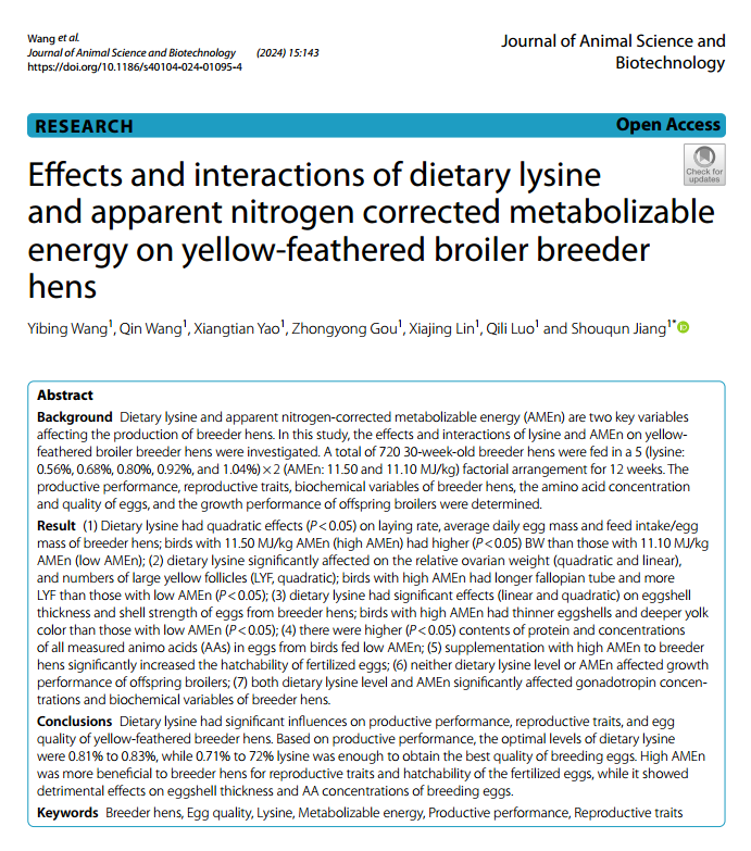 近日,动科所家禽营养研究团队在《Journal of Animal Science and Biotechnology》期刊(中科院农林科学一区TOPIF = 6.30)发表题为“Effects and interactions of dietary lysine and apparent nitrogen corrected metabolizable energy on yellow-feathered broiler breeder hens”的最新研究成果。动科所为论文第一完成单位,王一冰副研究员为论文第一作者蒋守群研究员为论文通讯作者。
