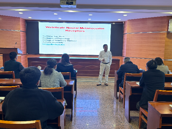 陶亚雄教授作了题为“Vertebrate Neural Melanocortin Receptors”的学术报告,系统介绍了G蛋白偶联受体及其药理学、生理学和病理学意义,详细阐明了黑皮质素4受体(MC4R)在调控人类和动物能量平衡和治疗肥胖的作用及其信号传导途径。还以水产动物为例,提出了治疗因受体突变导致肥胖的三种途径,重点讲解了药物分子伴侣的作用和筛选方法以及MC4R信号传导效应与发生突变后的解决方案。报告引起了与会者的极大兴趣,现场互动频繁,气氛十分热烈。