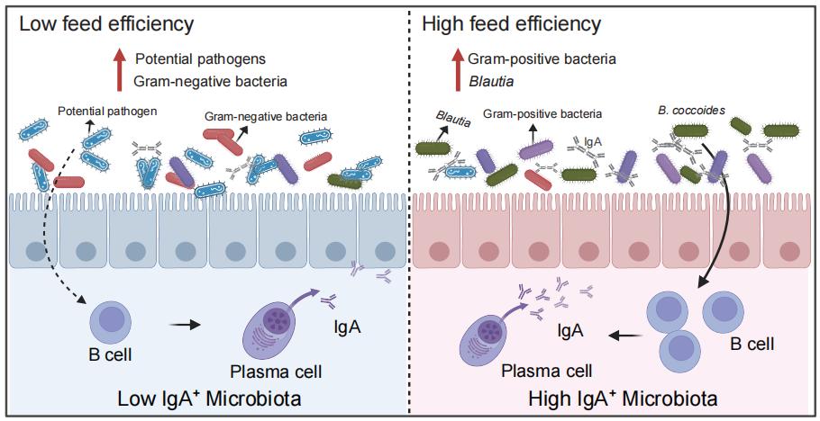 黄羽肉鸡是我国具有独立知识产权的畜禽品种,也是广东的优势种业。全国黄羽肉鸡年出栏量超35亿羽,约60%的品种来自广东。饲料耗用约占家禽生产总成本的70%左右,如何进一步提高家禽饲料利用效率是家禽育种领域重要的科学问题。肠道微生物作为宿主的第二基因组,在畜禽重要经济性状形成过程中发挥重要作用。有趣的是,近年来研究表明免疫球蛋白AIgA)作为肠道中分泌最多的抗体,可以调控肠道微生物组成和多样性。因此,本研究以长期选育的高/RFI惠阳胡须鸡遗传资源群体为研究对象,系统比较了高/低系的肠道微生物和IgA结合微生物的发育变化规律和组成差异;进一步通过粪便微生物移植(FMT)技术,明确了肠道微生物可显著影响鸡饲料利用率;整合盲肠微生物组和IgA结合微生物组信息,发现了宿主免疫IgA可通过结合Blautia调控黄羽肉鸡节粮性状,并阐明了通过诱导B细胞活化产生IgA的作用机制。