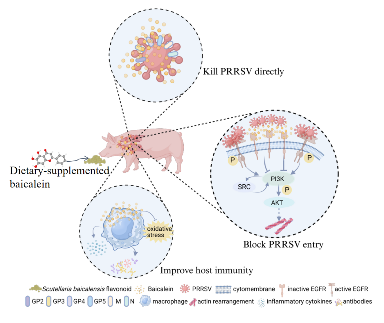 猪繁殖与呼吸综合征(PRRS,俗称蓝耳病),是全球养猪业面临的重大挑战之一,其病原PRRSV具有高度变异性,导致疫苗研发困难且抗病毒药物使用效果受限。蓝耳病显著降低饲料利用效率和猪只生长性能,增加饲养成本,开发有效的营养防控策略具有重要的产业意义。黄芩素(Baicalein)是一种从黄芩中提取的黄酮类化合物,具有抗炎、抗氧化和抗病毒等多种生物活性。本研究首先通过网络药理学、分子对接和分子动力学模拟精准地筛选并验证了黄芩素抗PRRSV的作用靶点,随后通过体外细胞试验和动物试验系统研究了其抗PRRSV的分子机制。研究发现,黄芩素不仅能直接与PRRSV结合,还能精准靶向表皮生长因子受体(EGFR)阻断病毒进入细胞,并显著增强仔猪的免疫反应。这一成果不仅为蓝耳病的防控提供了新的候选天然药物,也为通过营养手段提升猪的抗病能力提供了科学参考。