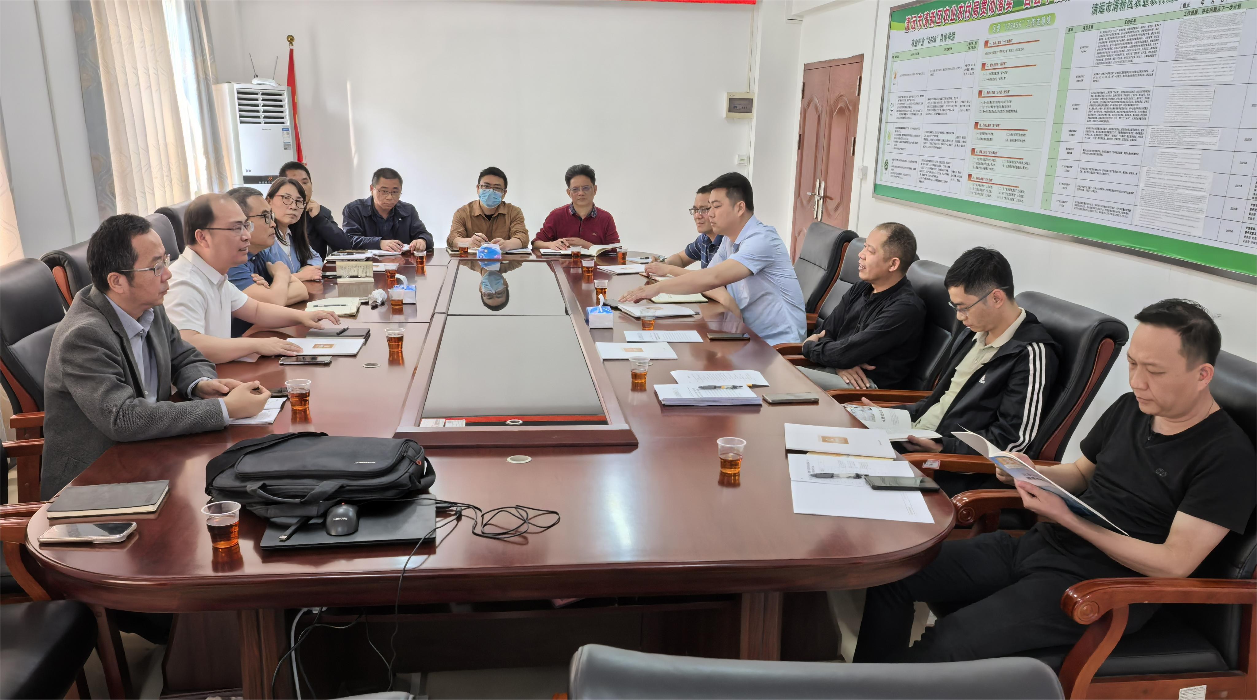 调研团队先后走访了清远市农业农村局、清新区农业农村局、清远市农业投资集团有限公司,与当地政府部门和企业进行了深入交流。清远市农业农村局党组成员、总畜牧兽医师黄军龙,清新区农业农村局党组成员、副局长郑广洪,清远市农业投资集团有限公司副总经理欧阳海龙、黎琼等领导及相关职能部门负责同志参与了交流活动。