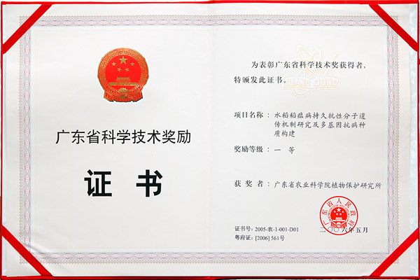 2006年广东省科学技术奖一等奖 --水稻稻瘟病持久抗病性分子遗传机制的研究及多基因抗性种质构建
