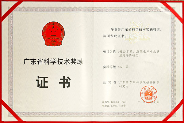 2007年广东省科学技术奖二等奖--安全水果、蔬菜生产中农药应用评价研究