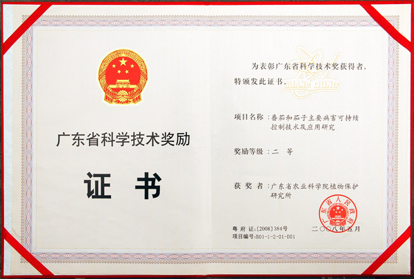 2008年广东省科学技术奖二等奖--番茄和茄子主要病害可持续控制技术及应用研究