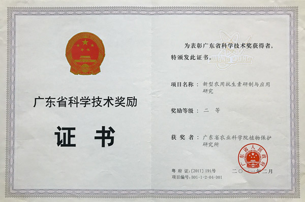 2011年广东省科学技术奖二等奖--新型农用抗生素研制与应用研究
