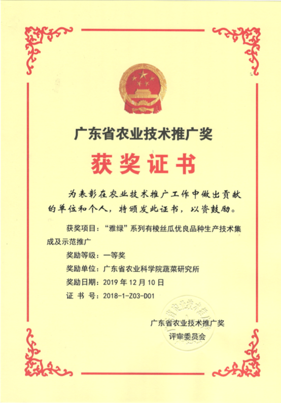 内容简介:针对有棱丝瓜生产中存在的优质、耐热品种缺乏、杂交种生产效率低下、栽培水平参差不齐、种植零星分布未形成大规模化生产、产销信息不对称等问题,育成优质、耐热、高产、抗病的“雅绿”系列有棱丝瓜新品种——雅绿6号、雅绿8号、雅绿9号丝瓜;根据“雅绿”系列有棱丝瓜新品种的特征特性,研发了配套的标准化安全高效栽培生产技术方案;创制晚开花有棱丝瓜种质资源,成功研发一套丝瓜简化制种技术,提高了制种效率;研发一套雅绿6号丝瓜杂交种子纯度鉴定技术,大大简化了杂交种子纯度鉴定的程序,提高了生产效率;通过与政府农技推广部门、农民合作社、种子销售商、蔬菜收购商紧密联系,形成了科研机构+农业推广中心(站)+公司(种子经销商、收购商)+合作社(农户)+互联网的育、繁、推、销一体化的闭环科技创新推广体系。截至2018年12月,该系列有棱丝瓜新品种累计示范推广面积4.9万公顷(73.5万亩),占广东省同类有棱丝瓜面积的35%以上,创社会经济效益77.18亿元,新增产值11.69亿元。