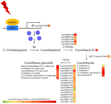 本研究利用代谢组学鉴定了丝瓜果实苦味物质主要是异葫芦素B、葫芦素D、23,24-二氢葫芦素E和葫芦素F。结合比较基因组学和转录组学鉴定了丝瓜葫芦素合成途径的关键基因Bi,通过酵母单杂交和双荧光素酶实验揭示了Bi受胁迫响应途径关键因子AREB1调控。研究结果首次鉴定了丝瓜苦味物质,并建立了与胁迫之间的直接联系,为进一步培育优质丝瓜品种奠定理论基础。