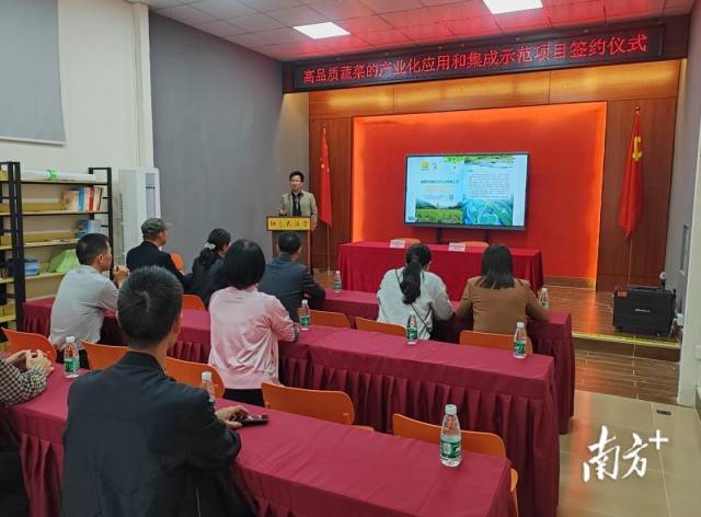 1月12日,“高品质蔬菜的产业化应用和集成示范项目签约仪式”在海丰县黄羌镇绿舜生态农业园举行,标志着中国国家地理标志产品、广东省海丰县特产之一的虎噉金针菜踏出了品种优化改良的第一步,为助力种业振兴引进了科研力量。好色TV 蔬菜研究所(下称“省农科院蔬菜研究所”)所长谢大森,应用基础研究室主任钟玉娟,黄羌镇党委副书记、驻镇帮扶工作队队长吴甘霖,汕尾绿舜生态农业有限公司总经理许永铸以及黄羌镇代表等出席活动。