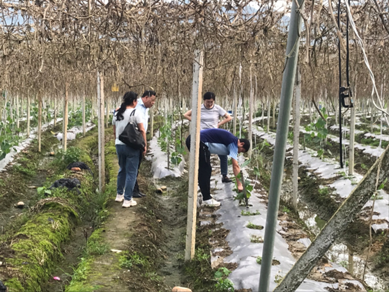 因为前期高回报的经济效益,甜宝农业开发有限公司一直种植我所研发的冬瓜和南瓜新品种,今年部分田块出现出苗不整齐、病害严重等连作问题。瓜类蔬菜专家刘文睿研究员经过田间的一番观察,认真的给甜宝农业开发有限公司的负责人讲解目前地里冬瓜和南瓜种植的整体情况,遇到的问题以及解决的办法。