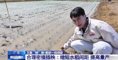 总台央视记者 李啸虎:这里是广东台山海宴镇的水田,现在农户正驾驶着农机进行插秧,每株水稻的间距在16厘米,而以往每株水稻的间距在20厘米到22厘米左右。通过合理密植技术,水稻的间距缩短了,每亩水稻的产量预计将提升10%左右。