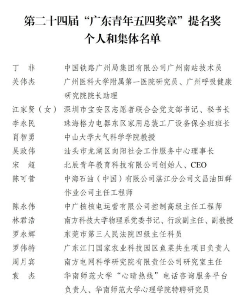 在庆祝中国共产主义青年团成立100周年之际,为集中展示新时代广东青年的精神品格和价值追求,充分发挥青年典型模范带头作用,团结引领广大青年踔厉奋发、砥砺笃行,以优异成绩喜迎党的二十大胜利召开,4月28日,共青团广东省委员会、广东省青年联合会联合印发《关于颁授第二十四届“广东青年五四奖章”的决定》(以下简称“决定”),决定授予王永标等18名个人、广州中医药大学第二附属医院(广东省中医院)大德路总院骨伤一科等10个集体第二十四届“广东青年五四奖章”。