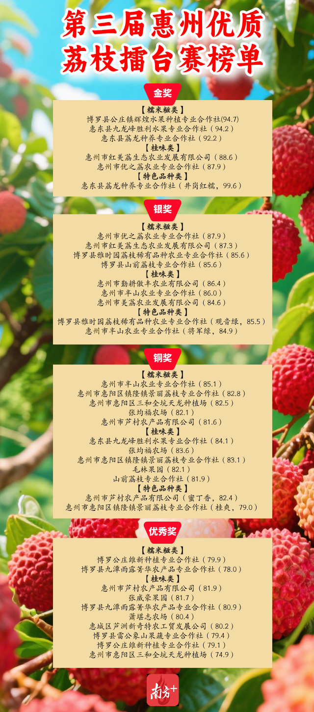 经过科学评比、果园回访和结果复核,惠州市第三届优质荔枝擂台赛结果揭晓。