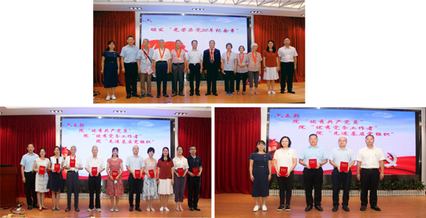 何秀古为“光荣在党50年”老同志颁发纪念章,全场用热烈的掌声表达对老党员始终对党忠诚、为党奉献的肯定,以及对老党员不忘初心、牢记使命的崇高敬意。所班子成员分别为获得院优秀共产党员、优秀党务工作者和先进基层党组织代表颁发荣誉证书,希望全所党员干部以受表彰的先进典型为榜样,把学习先进与深入开展党史学习教育结合起来,学党史、悟思想、办实事、开新局,不断开拓进取,为研究所的高质量发展贡献力量。