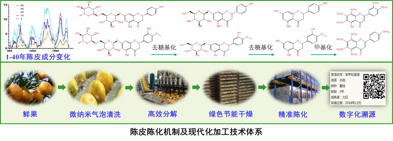 项目组始终坚持科技问题和产业需求为导向,围绕科学研究、技术创新、产品创制与工程化应用全链创新体系,针对特色柑橘加工产业存在的全果健康效应机制不明确、加工比例低、加工技术和装备水平不高、整体综合效益低等问题,表征了陈皮等特色柑橘全果主要活性成分,揭示了其营养健康效应及分子机制;探明了陈皮陈化机制,研创了陈皮现代加工、陈化、仓储和溯源等关键技术,突破了茶枝柑果肉高值化利用技术,创建了休闲食品自动化加工技术及装备,实现了传统产业转型升级和提质增效;创新了柑橘全果制汁、皮渣高效制备活性物质等关键技术,设计创制系列新产品并实现产业化。