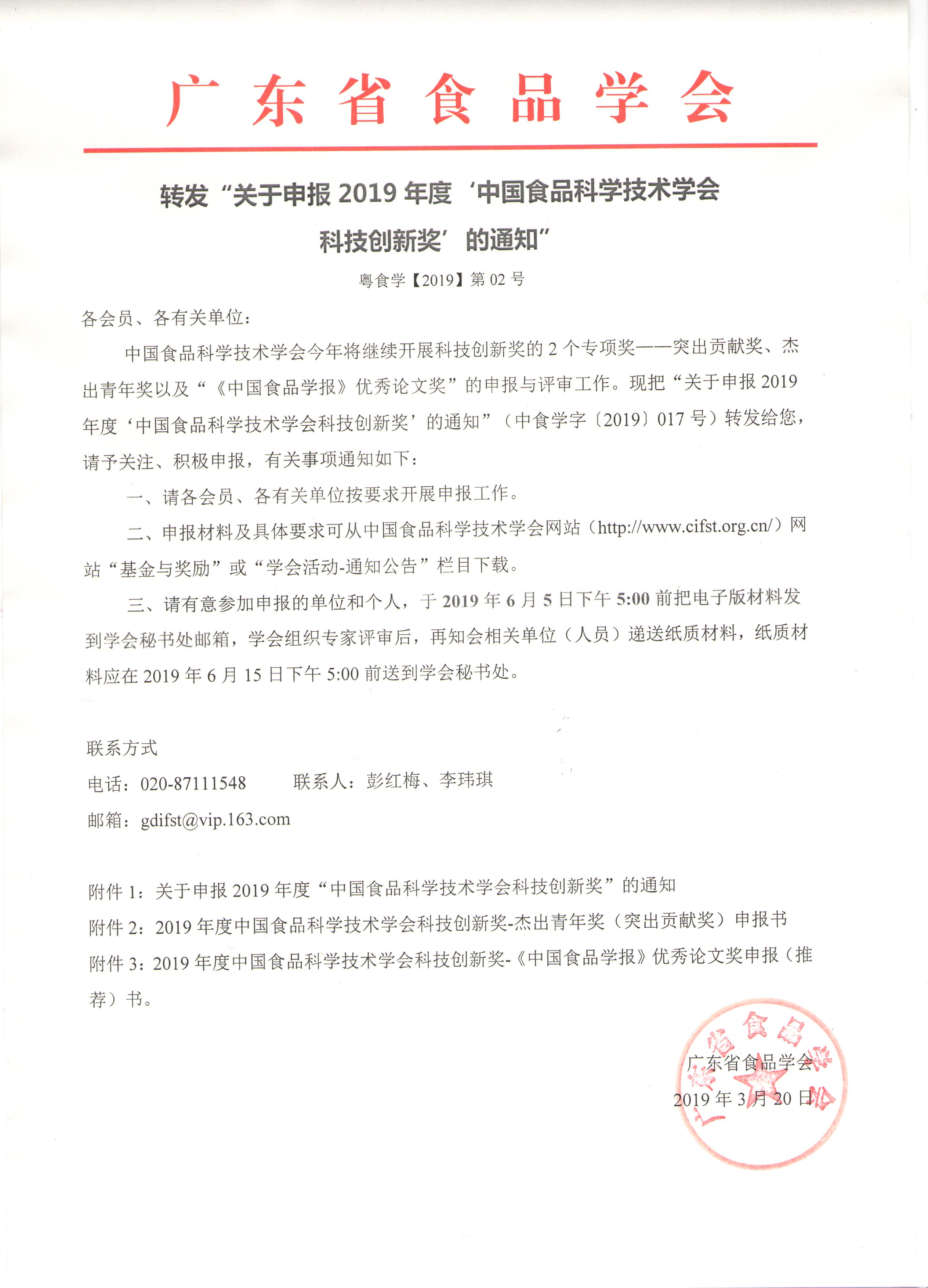 - 转发关于申报2019年度‘中国食品科学技术学会科技创新奖’的通知2019-03-21