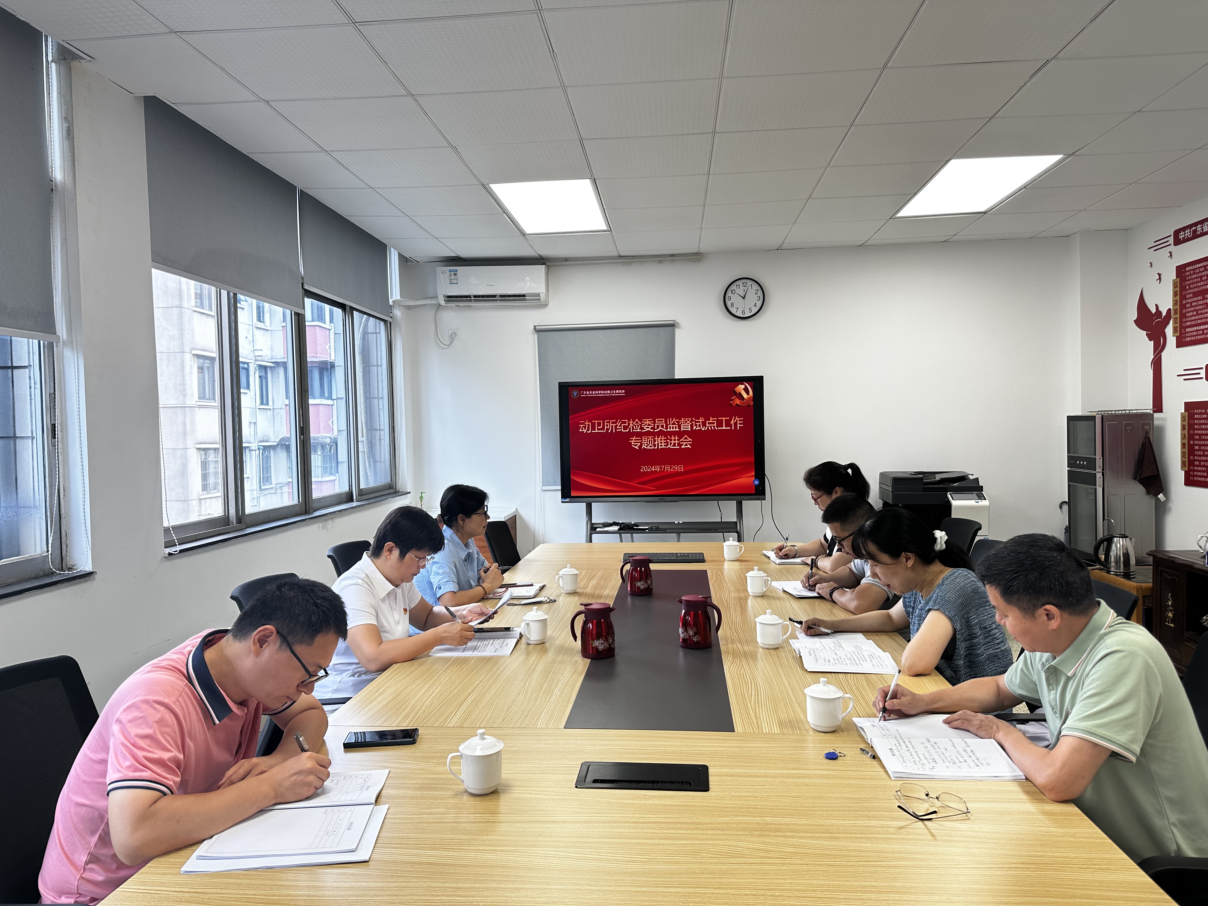 7月29日,动卫所召开纪检委员监督试点工作推进会,所党总支书记梅盈洁、所党总支纪检委员黄童焱和在职党支部纪检委员参加会议。