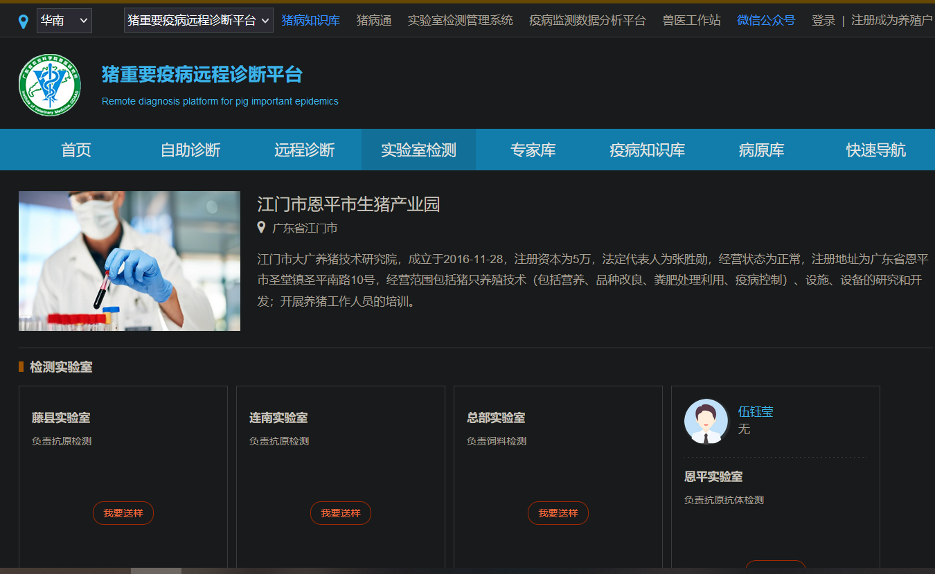 生猪重要疫病远程诊疗平台是动卫所在国家“十三五”重点研发计划项目等支持下创建的多功能一站式远程诊疗平台。为帮助恩平生猪特色产业园生猪疫病的高效防控、促进产业园的数字化智能化发展,近日,动卫所李春玲专家团队和广东省科技基础条件平台中心为产业园建设了江门市恩平生猪产业园实验室检测管理系统。
