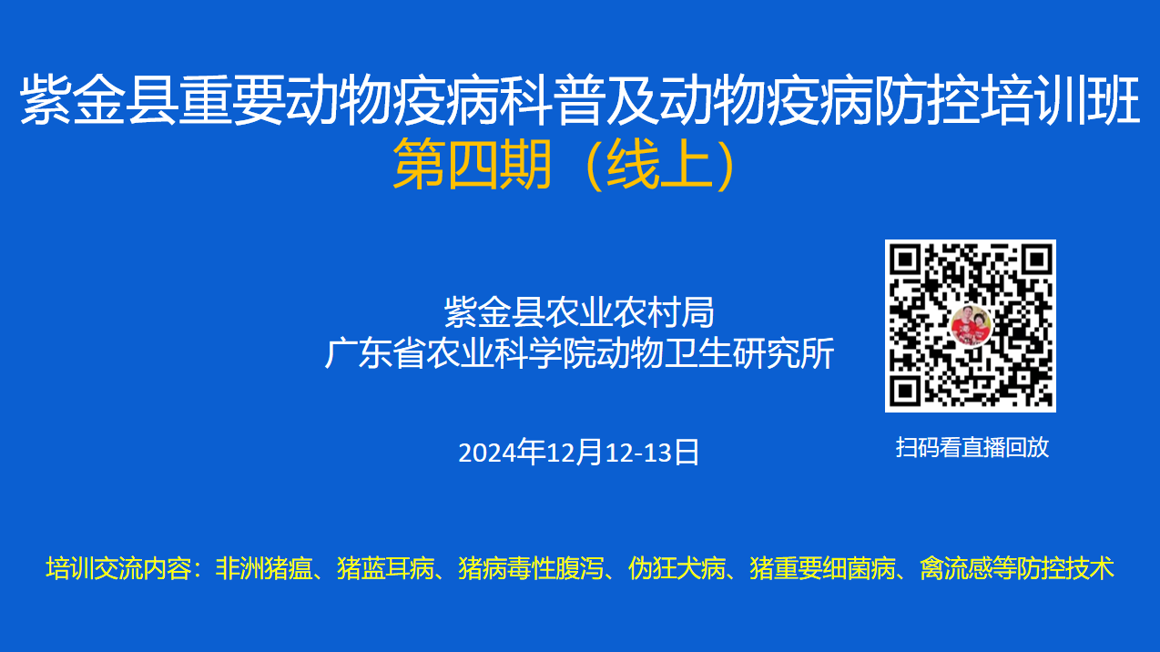 根据国家、省、市对动物重要疫病及人畜共患病的防控部署要求,为有效预防控制动物疫病流行,提高紫金县动物防疫人员业务技术水平,做好动物疫病防控工作,12月1日-13日,动卫所和紫金县农业农村局联合举办四期“紫金县动物重要动物疫病科普及动物疫病防控培训班”,猪病研究室李春玲研究员、翟少伦研究员、李艳副研究员、蒋智勇副研究员、勾红潮副研究员、张昆丽青年研究员以及河源市动物卫生技术中心魏莉兰高级兽医师等专家为学员作技术培训,来自紫金县的官方兽医、防疫员、养殖户共350多人参加培训,其中前三期为线下培训、第四期为线上培训。
