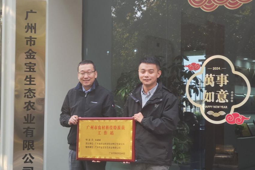 为推进实施广州市“百县千镇万村高质量发展工程”促进城乡区域协调发展,落实《广州市进一步深化农村科技特派员工作行动方案(2022—2024年)》,1月17日,动卫生所副所长张建峰研究员带领张春红正高级兽医师、刘志成副研究员等团队成员到广州市金宝生态农业有限公司开展调研交流指导工作,并举行“广州市农村科技特派员工作站”挂牌仪式。广州市白云区动物卫生监督所所长叶盛恒、副所长张爱荣,广州市金宝生态农业有限公司叶俊杰经理等参加相关活动。