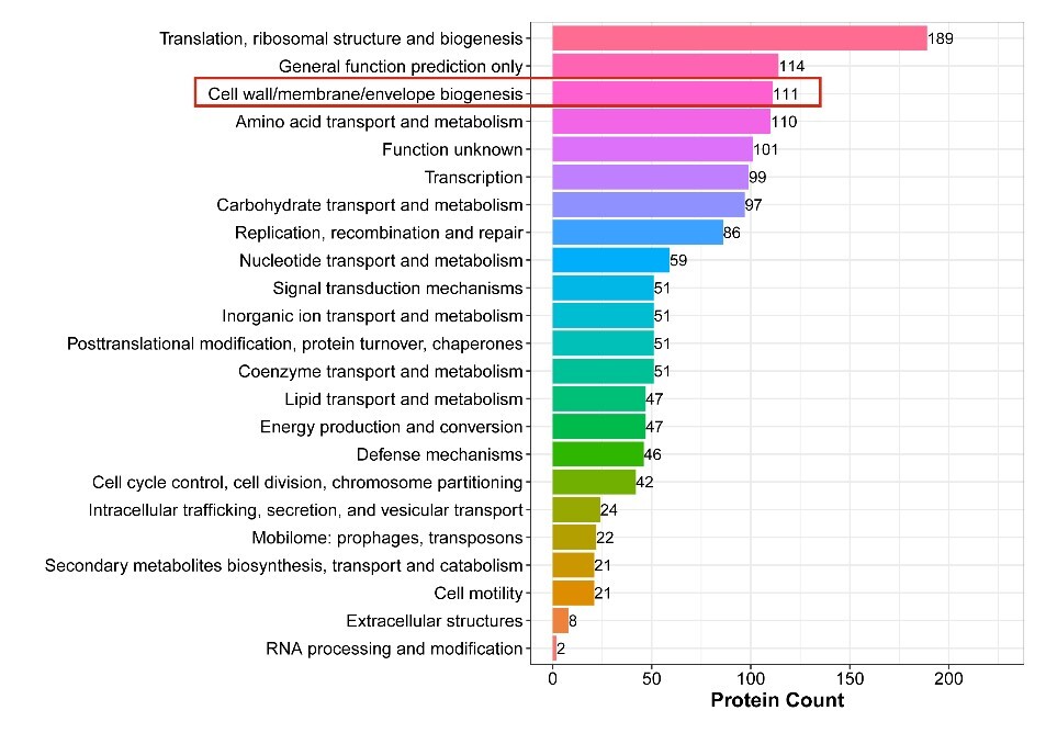 图5.DEPs的COG注释。x轴显示COG项,y轴显示相应的蛋白质计数,说明不同功能的蛋白质数量。