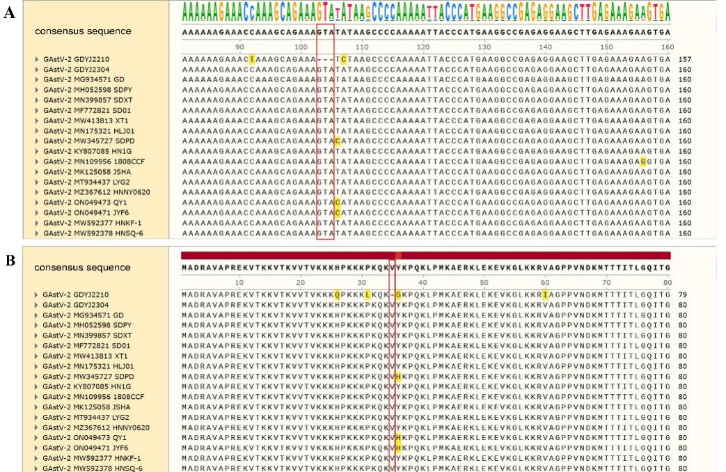 GAstV引起的致死性雏鹅痛风病疾病仍是我国养鹅业疫病防控面临的巨大挑战,其可导致雏鹅生长抑制和痛风发生,造成了较大的经济损失。为了解广东省GAstV的流行特点,本研究整合分析了2022-2024年间多地市养鹅场共682份样品。结果显示,所有样品均为GAstV阳性,且GAstV-2仍然是优势基因型毒株。本研究共分离到3株GAstV,与GDYJ2304分离株和其他已报道的GAstV-2毒株相比,GDYJ2210分离株的ORF2区域缺少3个碱基,且复制能力显著高于增强。