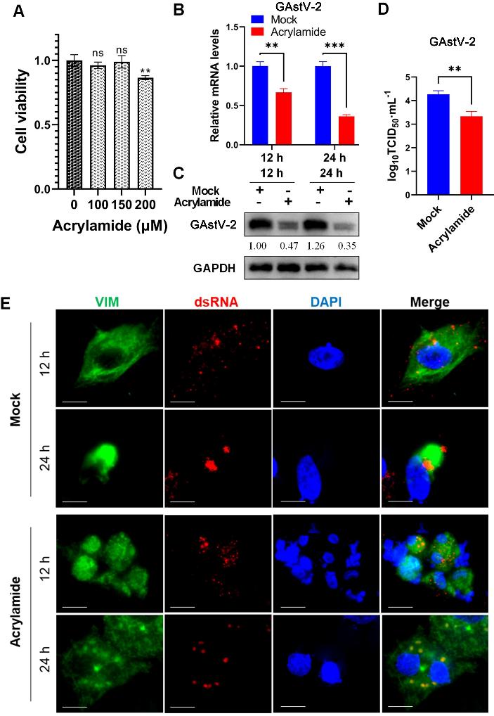 目前关于GAstV感染及复制的分子机制研究进展尤其缓慢。VP70作为GAstV的结构蛋白,与病毒的侵入和复制密切相关。为了更好地了解VP70在GAstV-2感染中所发挥的作用,本研究以鹅胚原代肾细胞为研究平台,结合免疫沉淀和质谱分析的方式去捕获与VP70发生互作的宿主分子。结果显示,细胞波形蛋白(Vimentin, VIM)是VP70的宿主结合伴侣之一,VIM可通过与VP70相互作用以正向调节GAstV-2的复制,且VIM-VP70的互作和完整的VIM网格结构是GAstV-2高效复制所必需的。本研究为GAstV致病机制的深入探索奠定了重要的理论基础。