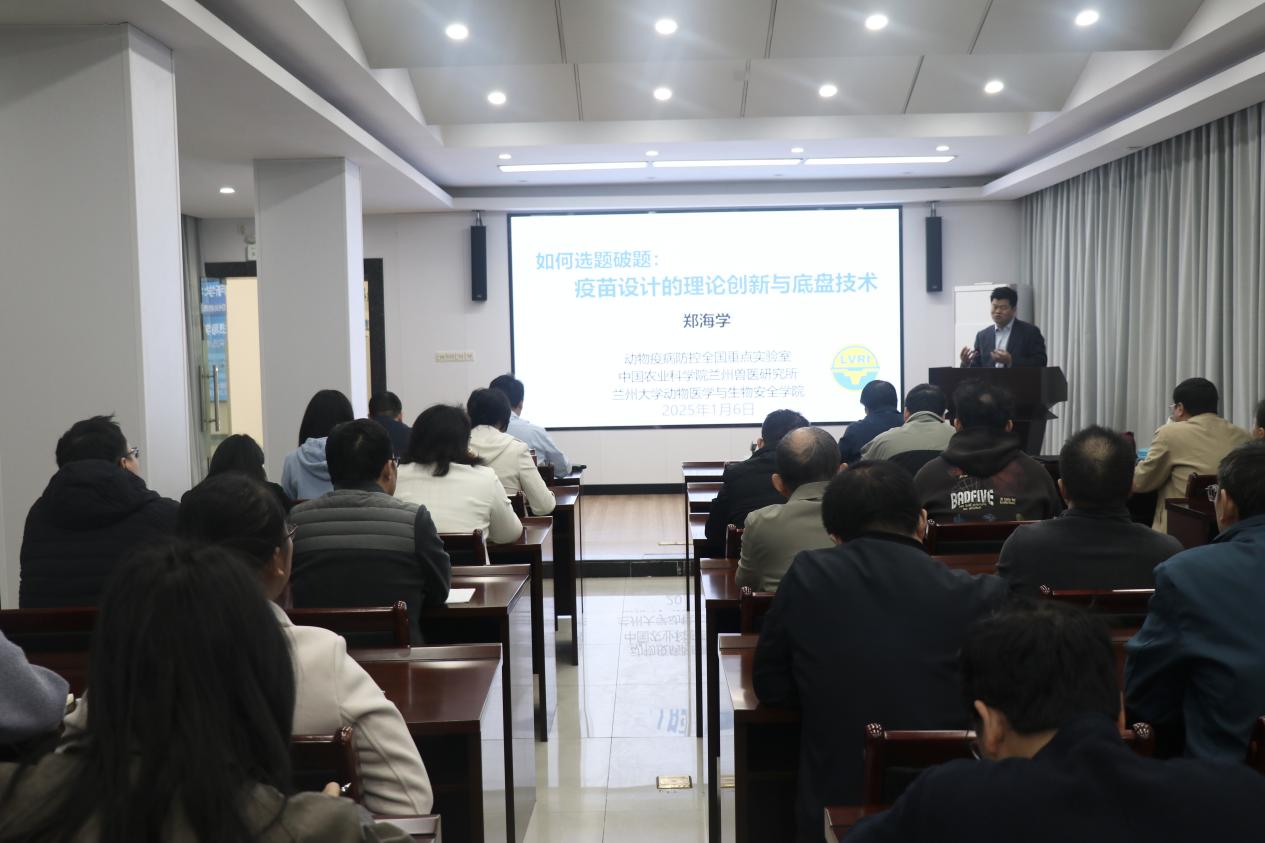 为加强科研合作与交流,拓展科技人员科研视野,1月6日,动卫所特邀中国农业科学院兰州兽医研究所所长郑海学研究员到所开展学术专题报告。动卫所所长孙铭飞、副所长王刚、张建峰、科技人员及研究生等50余人参加会议。会议由孙铭飞主持。
