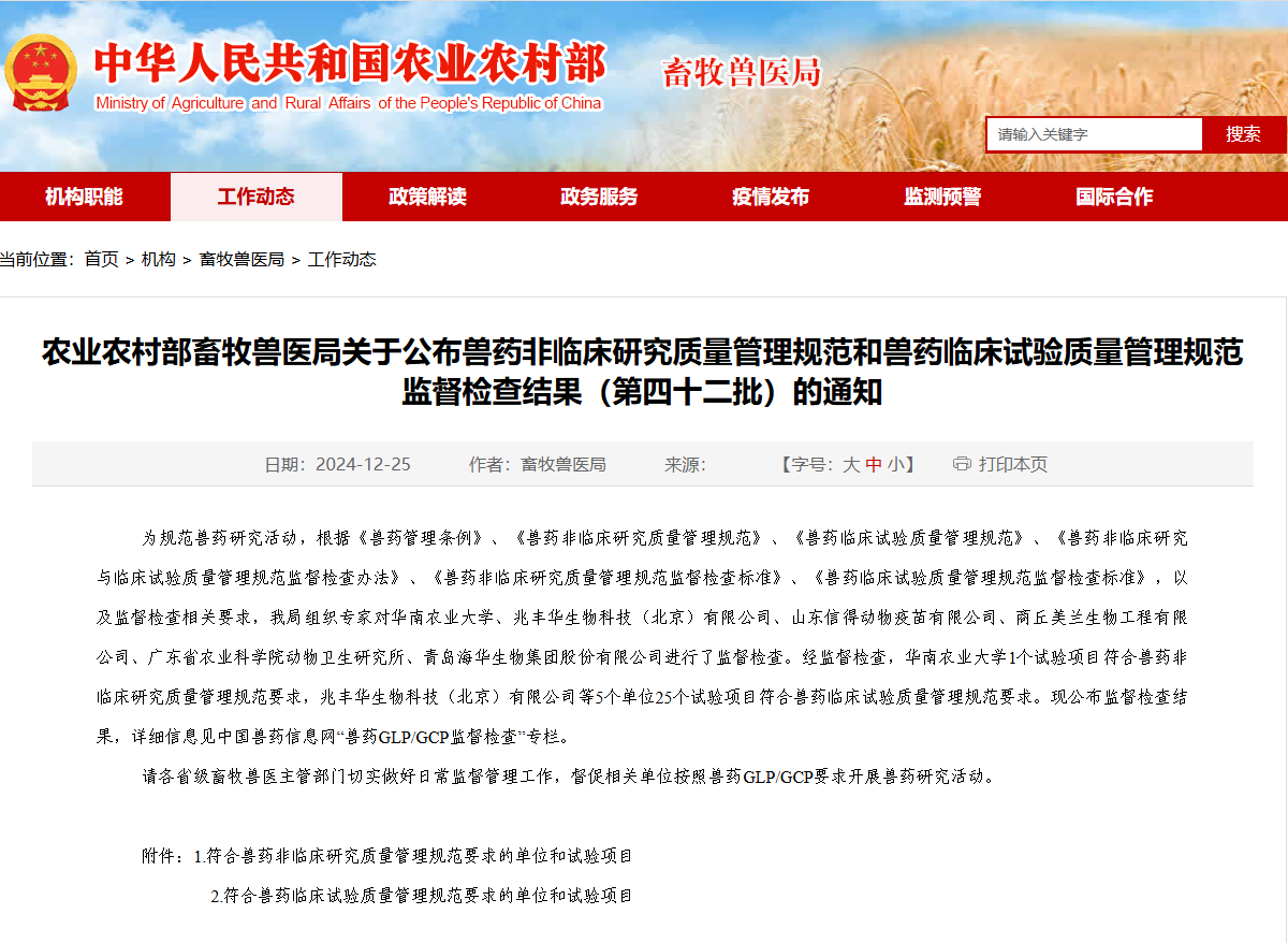 12月25日,农业农村部畜牧兽医局公布了《农业农村部畜牧兽医局关于公布兽药非临床研究质量管理规范和兽药临床试验质量管理规范监督检查结果(第四十二批)的通知》,好色TV 动物卫生研究所的猪药效评价试验、猪药代动力学试验、宠物类药效评价田间试验、禽类药代动力学试验4个中化药GCP试验项目符合兽药临床试验质量管理规范要求。这也是动卫所继今年3月份获得4个生物制品类GCP项目后再次通过农业农村部GCP监督检查。