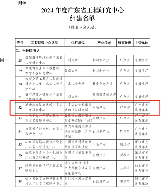 近日,广东省发展和改革委员会发布组建2024年度广东省工程研究中心的相关通知,全省共批准建设38家工程研究中心。我所申报的“动物疫病综合防控广东省工程研究中心”(以下简称“中心”)成功入选,是本次23家学校院所类中心之一,这彰显了我所在全省动物疫病防控领域的核心研发能力和产业影响力。
