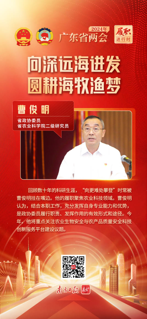 而针对广东传统的近海养殖,曹俊明在2023年省两会期间提交提案,为绿色高效解决水产养殖尾水治理的产业问题献实策。他建议加大对水产养殖尾水治理创新技术、新模式的研发力度和推广应用,并积极联合省内其他科研机构,希望合力推动广东水产养殖绿色高质量发展。“以‘疏近利远’的思路,进一步促进近海养殖绿色生态发展,同时帮助其向深远海发展。”他说。